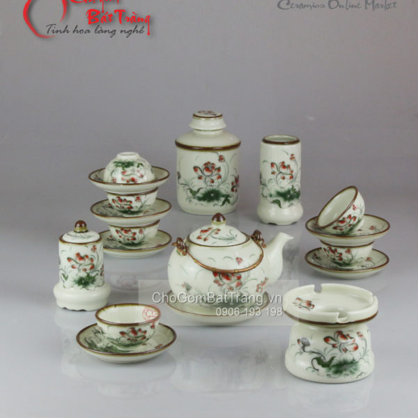 Bộ ấm chén men kem gồm: 1 ấm 6 chén và 7 đĩa kê, 1 bình đựng trà, 1 gạt tàn thuốc lá, 1 bình tráng trà, 1 ống đựng tăm