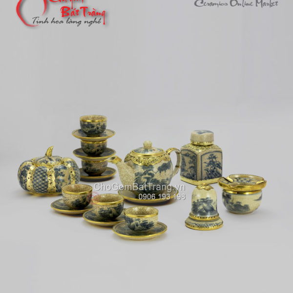Bộ ấm chén Minh Long men rạn bọc đồng và 4 phụ kiện được tạo nên từ những bàn tay khéo léo của những người thợ gốm Bát Tràng. Bộ ấm chén men rạn bọc đồng đều được làm bằng loại đất sét cao cấp tạo nên xương gốm cứng chắc và bên ngoài được phủ một lớp men rạn cổ đặc trưng của làng gốm cổ truyền Bát Tràng mà không nơi nào có tạo nên nét riêng biệt của gốm sứ men rạn cổ Bát Tràng. Sự kết hợp hài hòa giữa những họa tiết bằng đồng với bộ ấm chén đã tạo nên một bộ ấm chén giả cổ bọc đồng tuyệt đẹp của gốm sứ Bát Tràng.