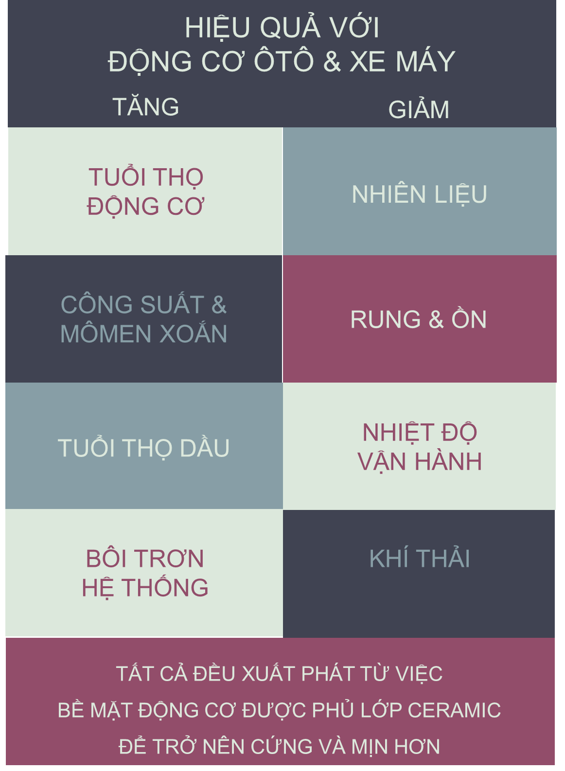 Bề mặt động cơ trơn nhẵn, cặn bẩn không bám vào được, đồng thời bị thành phần của Cerma ép ra ngoài bộ lọc. Động cơ được gia cố, bảo vệ và liên tục làm sạch..