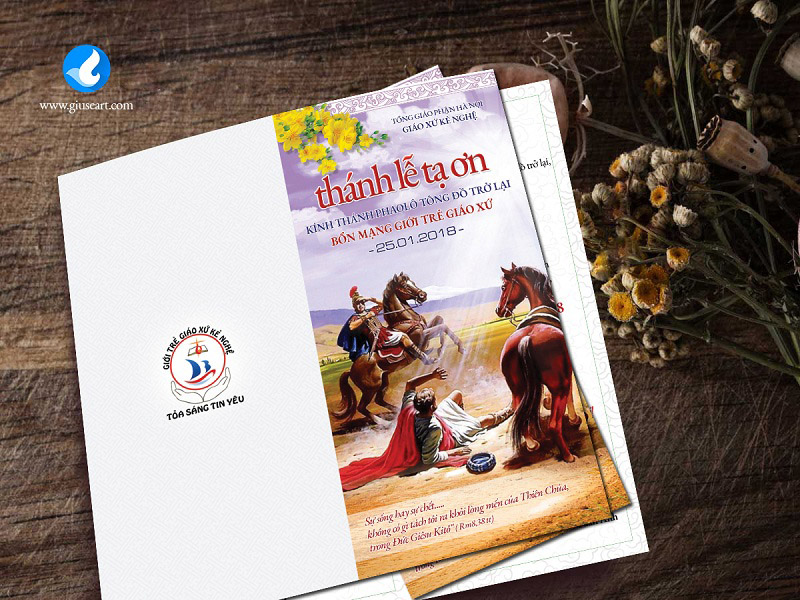 Các bạn Giới trẻ Giáo xứ Kẻ Nghệ mừng Quan Thầy vào ngày 25.1.2018, Kính Thánh Phaolô Tông đồ trở lại. Yêu cầu thiết kế thiệp mời là làm sao toát lên vẻ đẹp sang trọng, lịch sự nhưng vẫn đầy ý nghĩa và sự thánh thiện.